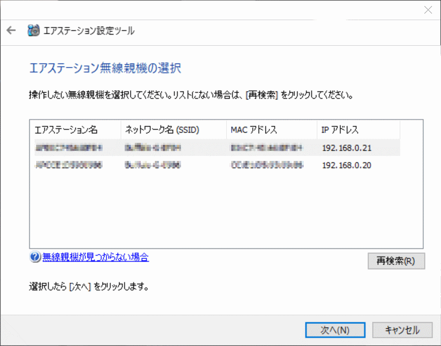 ということで、Wi-Fi接続のみを有効にした状態でエアステーション設定ツールを実行すると、次のように無線親機を見つけることができました。