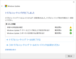 2018-04 x64 ベースシステム用 Windows 10 Version 1709 の累積更新プログラム(KB4093112) この更新を適用しようとして再起動を実行するのですが、数分後にエラーが発生して再起動できない状態。 検索してみると、 Windows Update トラブルシューティング ツール このようなツールがありました。 早速「Windows 10 用トラブルシューティング ツールのダウンロード」をクリックして実行。 これで再起動できました。 「1709 の累積更新プログラム(KB4093112)」がスキップされた様子です。 あらためて Windows Update を確認すると、 Windows 10、バージョン 1803 の昨日更新プログラム のダウンロードが進行中。 これで大丈夫そうです。