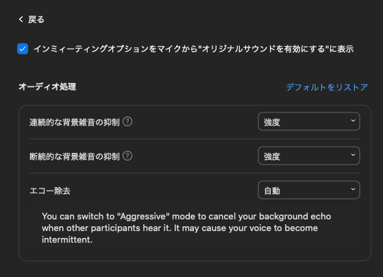 ちなみに上の画面では「連続的な背景雑音の抑制」と「断続的な背景雑音の抑制」を両方とも「強度」にしています。デフォルトは「自動」です。利用環境によって設定を変えてみると良いかもしれません。