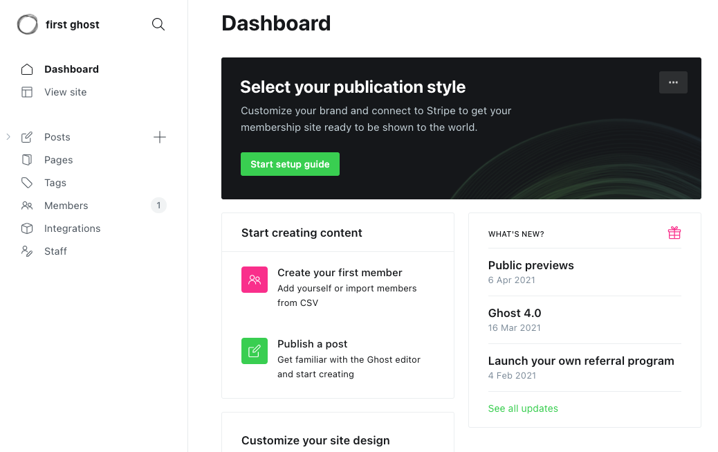 ghost install localダッシュボードはこのような感じです。