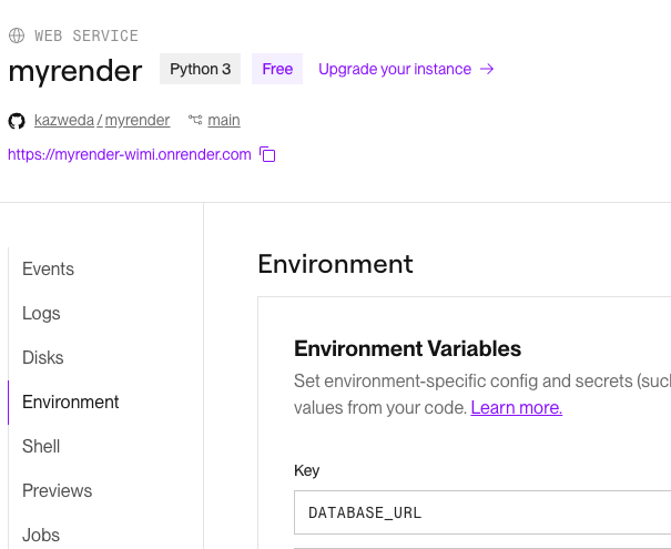 上記の中で DATABASE_URL, SECRET_KEY はRender側から提供されます。
